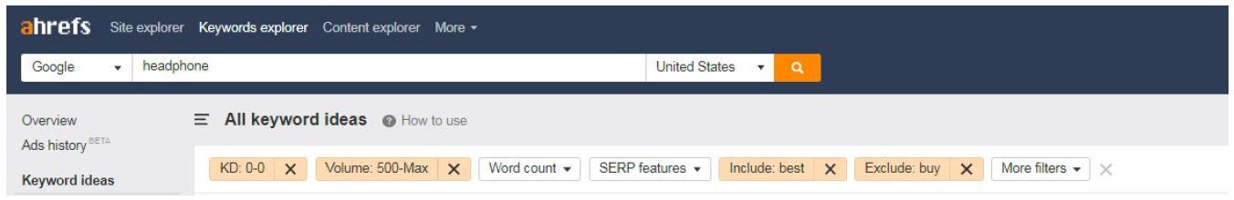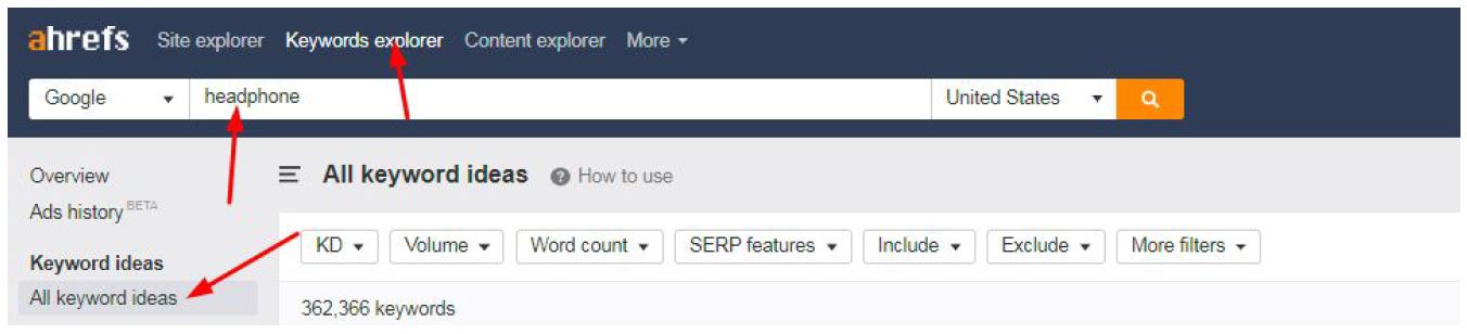 First, go to Ahrefs, open Keyword Explorer, put in seed keyword (headphone), then click on the Search icon, after that click on the tab All keyword ideas on your left side panel.