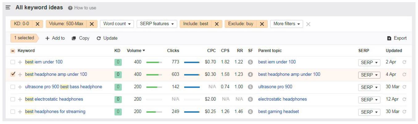 As you can see, there are many keywords related to headphones with very low competition levels (KD 0). However, refrain from using these keywords. Our goal is to identify low authority websites.