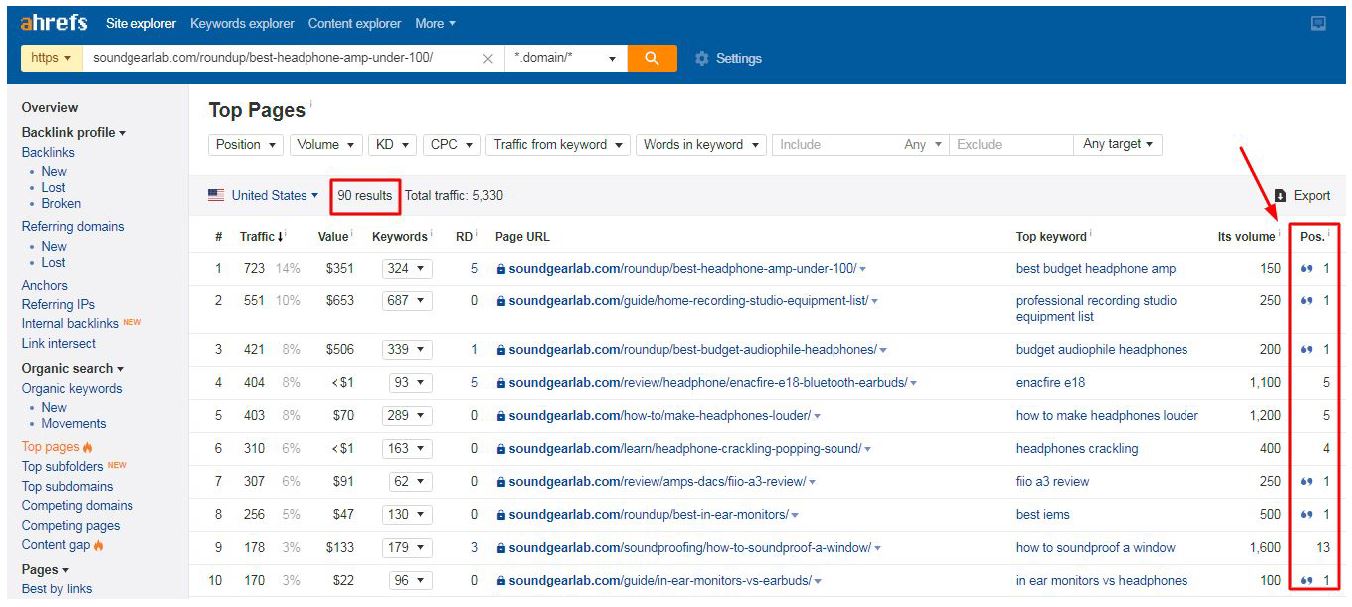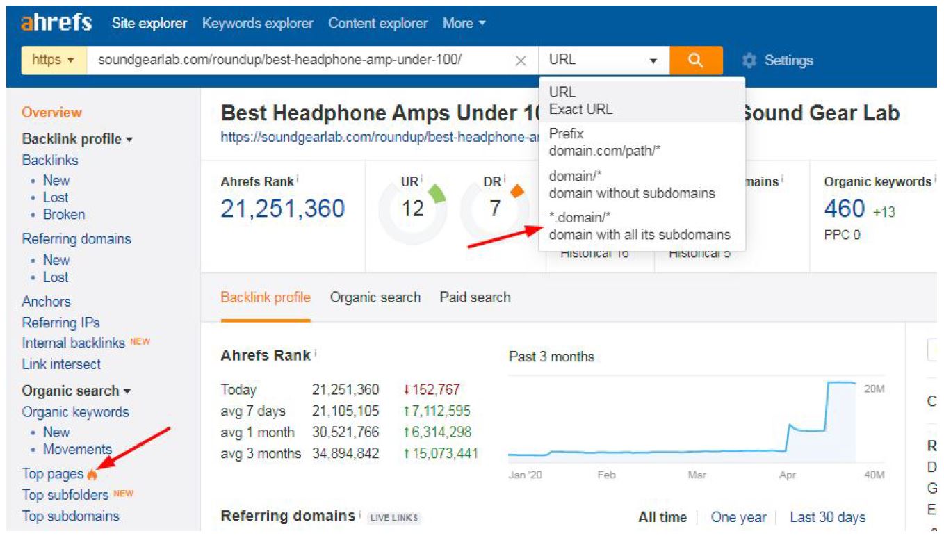Look at the left side panel, you may want to check the Organic keywords and the Top pages tab. For example, let’s see the Top pages of this website: